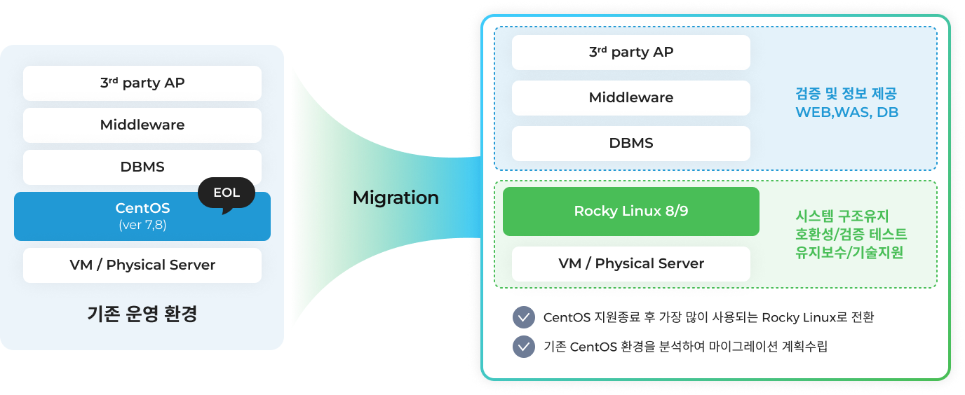 - 기존 CentOS 환경의 운영 설정을 유지하면서 배포판을 전환하는 서비스